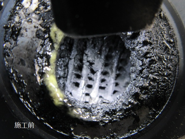 硬質化した煤が溜まり洗浄剤を入れても流れ落ちていきません。