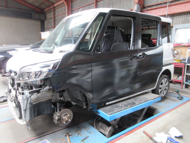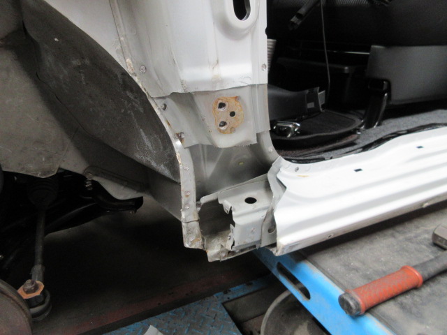 フレーム修正機で粗出し、歪んだ部品カットして新品部品溶接して取り付けて行きます。