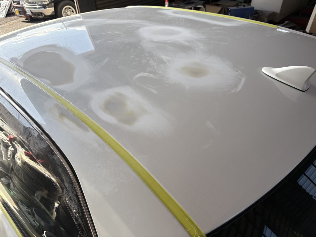 多数の凹みがあり板金塗装の様子です。 カラーはパールホワイトになります。
