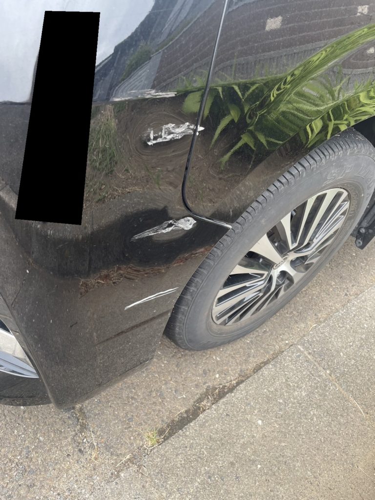 左フロント大きく損傷しており、応急的にタイヤ転がるようにしレッカー致しました。