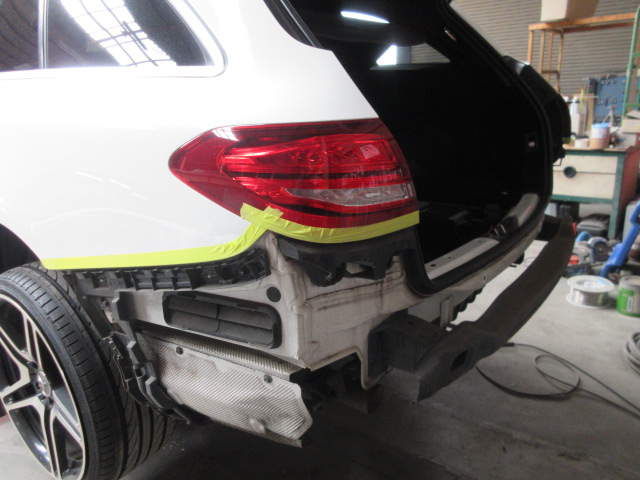 リアバンパー板金塗装ご依頼です。新品高額にて板金塗装にて対応していきます。